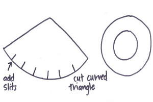 Fold triangle into a cone. Slide cone into one doughnut piece. Flip up slits to the underside of the hat.