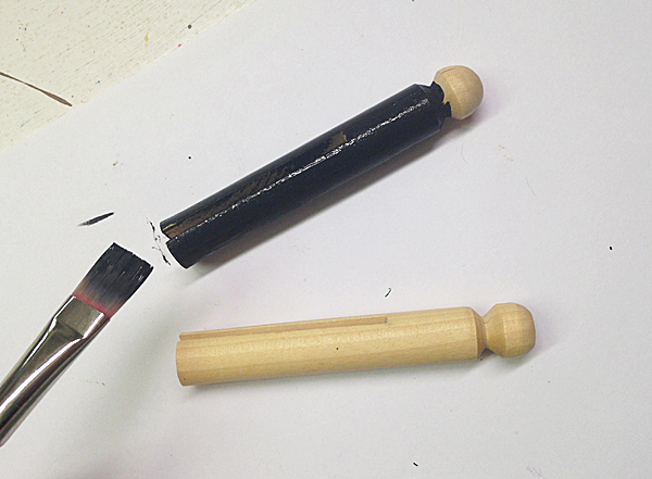 - Stretch the paper out. With the clothespin laying on the table, insert the 5" side of the paper, painted side facing up, into the clothespin's slot.