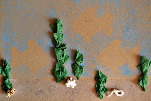 Cut 12 small squares from the green crepe paper. Fold the first square in half, and then in half again. Crumple the small folded square to form an uneven diamond shape and glue it to the cardstock. Fold another square in the same way to make a crumpled diamond and glue it above the first. Continue adding crumpled diamonds to complete the strands of seaweed.