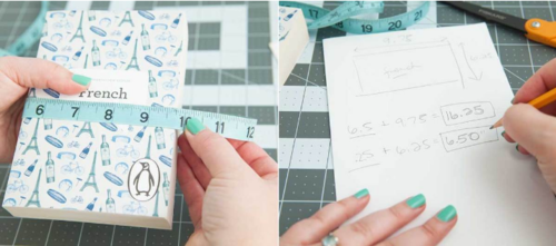 Using a tape measure or ruler, measure the height and complete length of the book to be covered. Add exactly 6 1/2” to the length and exactly 1/4” to the height. This is how large the book cover needs to be.