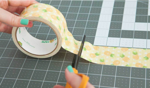 Cut pieces of of duck tape in half to make the decorative edge of the book cover. Place the folded book cover on top of the strip and wrap up to secure. Create decorative edges on both the top and bottom.