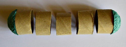 Depending on the child's age, this step may need help from an adult. Press the toilet paper rolls flat. Measure and cut five rings from the flattened rolls, each with a width of 2". Pop each ring out again, shaping them into nice circles.