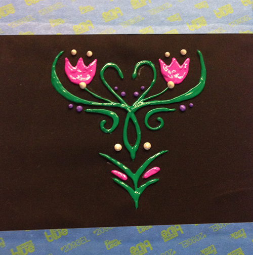 Use the marker to sketch the flowers, then retrace them with the paint. Work from left to right to prevent smudging. Start with the tall flower first, then the shorter flower second.