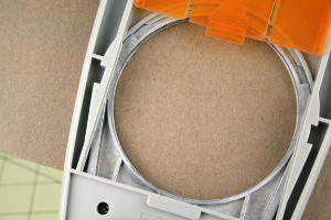 - Again, once finished, turn the chipboard over and use your detail scissors to trim around the scalloped edge for any embellishment/paper strips that overhang the edge.