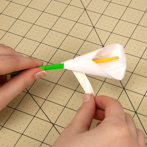 Wrap the petal around the middle, making a cup shape. Secure with a small piece of Duck Tape® at the base of the flower. Bend your petal to form any shape you want, too.