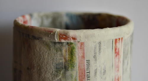 Add a second and third layer in the same way, every time allowing it to dry for 24 hours before continuing. For a neater finish, also glue newspaper strips over the top edge of the can.