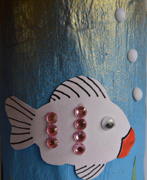 Glue the fish onto the can. Use your finger to gently smooth it down. Glue the pink rhinestones to the body of the fish.