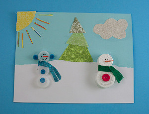 - Pipe white glue onto the bottom of each plastic lid and stick to the card stock canvas, creating snowmen.